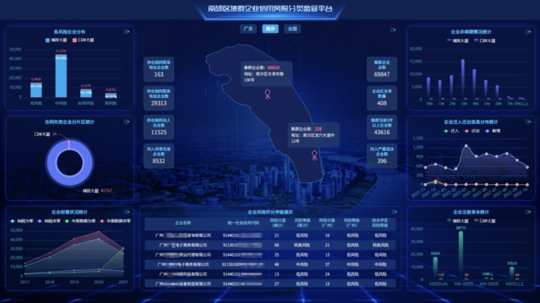 通过探索特色信用风险分类指标,南沙实现了为企业“画像”。相关企业的实际办公场所分布信息、地址合同信息、存续情况、迁移情况、信用风险数据、注册资本情况和经营状况等信息,都能通过南沙区集群企业信用风险分类监管平台进行实时数据归集和展示。