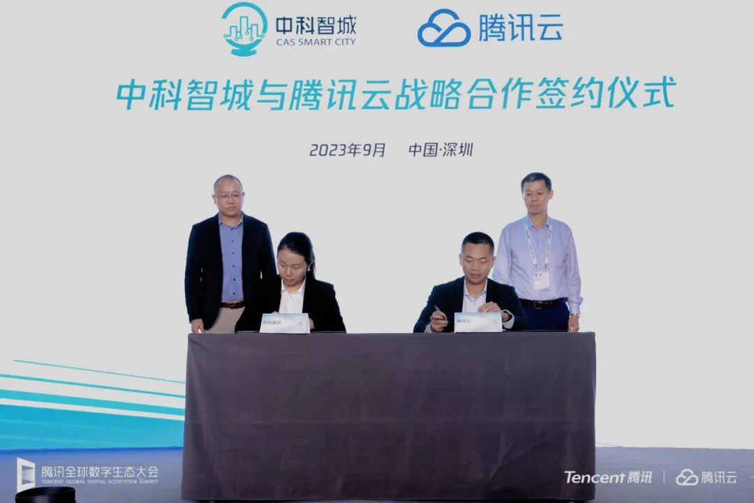2023年9月8日腾讯召开全球数字生态大会(智变加速·产业焕新),广州软件应用技术研究院(简称:广州软件院)孵化企业中科智城(广州)信息科技有限公司(简称:中科智城)作为重要合作伙伴,与腾讯云计算(北京)有限责任公司签订《战略合作协议》形成强强联合。大会现场,签约代表中科智城(副总裁蔡喆菁、腾讯云与智慧产业广东省总经理王健代表双方进行签约,鉴签代表广州软件院常务副院长、中科智城董事长袁峰,腾讯云副总裁政务行业负责人王景田一同参加签约仪式。